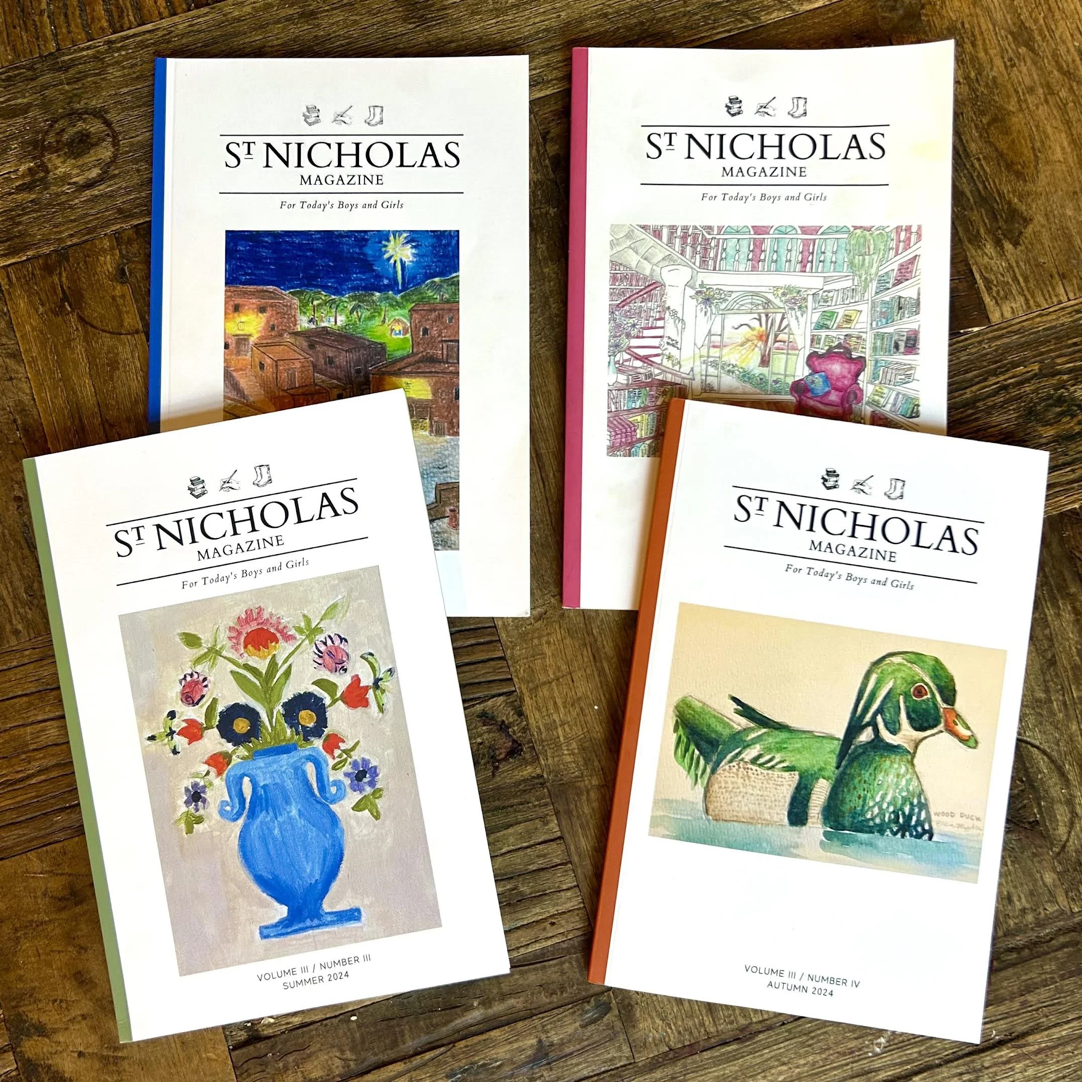 When I first thought of creating a magazine, I was inspired by a real monthly for kids from the turn of the century. Some of the authors featured in the original St. Nicholas were Louisa May Alcott, Frances Hodgeson Burnett, and Alfred Lord Tennyson. There were also stories, poems, art, book reviews, and special assignment entries by kids. I have about twenty vintage "numbers" (that's what they called issues), the earliest from 1880 and the latest from 1927! They are really fun and interesting.